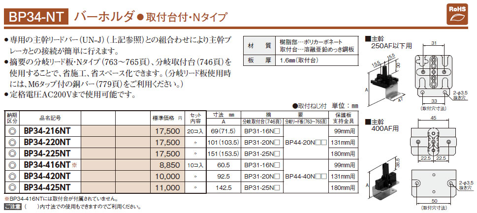 BP34-425NT バーホルダ 取付台付 Nタイプ