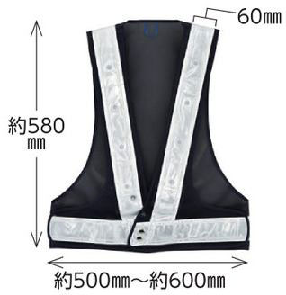 メーカー:日本緑十字社 サイズ フリー(面ファスナーによる調節) 材質 メッシュ部:ナイロンメッシュ 反射帯:エンビ 質量 約310g(電池除く) 使用電池 単3乾電池×2本(別売) 仕様 LED前後各8個(計16個) 連続点滅の場合約150時間 ※写真の寸法表記は平面です。胴まわりではありません。