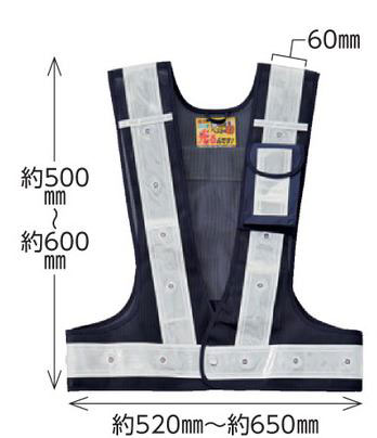 サイズ フリー 材質 メッシュ部:ナイロンメッシュ 反射帯:エンビ 質量 約370g(電池除く) 仕様 横520~650mmの調節が可能 面ファスナーによる調節 反射帯60mm幅 LED24個付き 連続点滅の場合約40時間 万能ポケット:左胸前部1箇所・腰内部2箇所(ポケット部分にはLEDはありません)