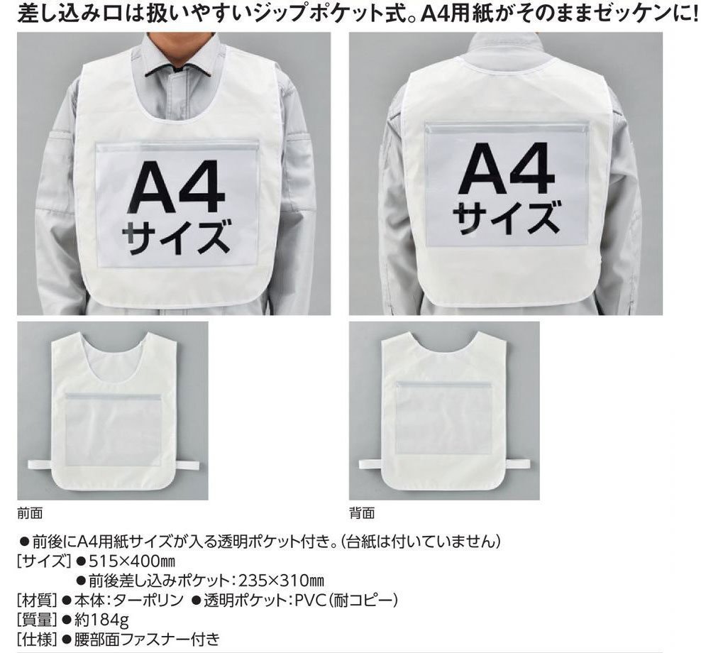 メーカー:日本緑十字社 サイズ 515×400mm 前後差し込みポケット:235×310mm 材質 本体:ターポリン 透明ポケット:PVC(耐コピー) 質量 約184g 仕様 腰部面ファスナー付き 前後にA4用紙サイズが入る透明ポケット付き(台紙は付いていません)