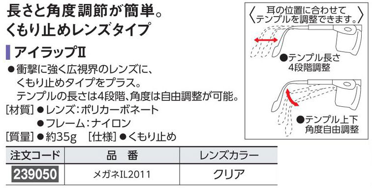 メーカー:日本緑十字社 レンズカラー クリア 材質 レンズ:ポリカーボネート フレーム:ナイロン 質量:約35g 仕様 くもり止め