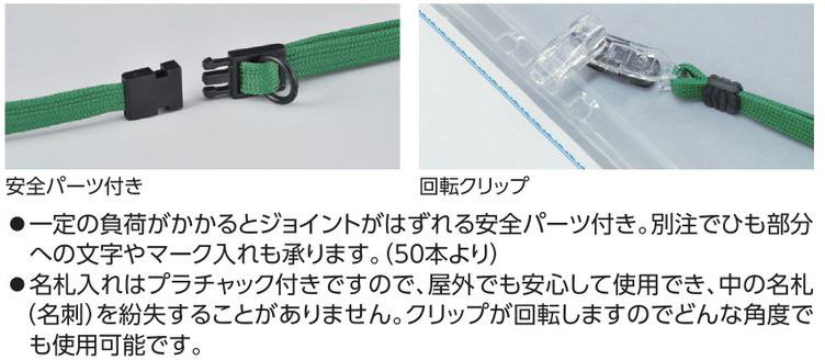 サイズ 名札入れ:90×110mm 中紙:70×100mm ひもの長さ:約900mm(幅約10mm) 材質 名札入れ:オレフィン ひも:PET クリップ ポリカーボネート ジョイント部:ポリアセタール カラー(ひも) 緑 10本1組