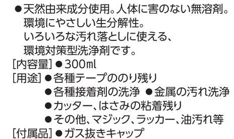 内容量 300ml 用途 各種テープののり残り 各種接着剤の洗浄 金属の汚れ洗浄 カッター、はさみの粘着残り その他、マジック、ラッカー、油汚れ等 付属品 ガス抜きキャップ ※使用方法をよく読み、目立たない所でテストを行ってから、正しくご使用ください。※火気厳禁・高温注意