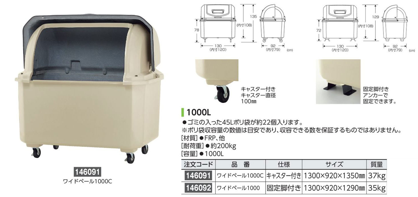 - ワイドペール 1000L 固定脚付 146092 ワイドペール1000