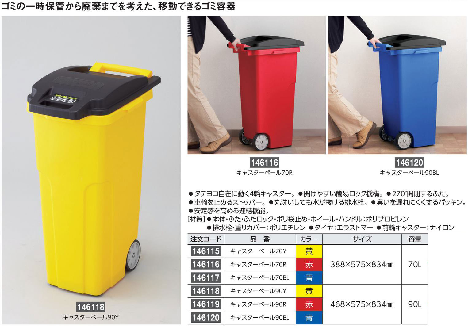 メーカー:日本緑十字社 カラー 黄 サイズ 388×575×834mm 容量 70L 材質 本体・ふた・ふたロック・ポリ袋止め・ホイール・ハンドル:ポリプロピレン 排水栓・重りカバー:ポリエチレン タイヤ:エラストマー 前輪キャスター:ナイロン