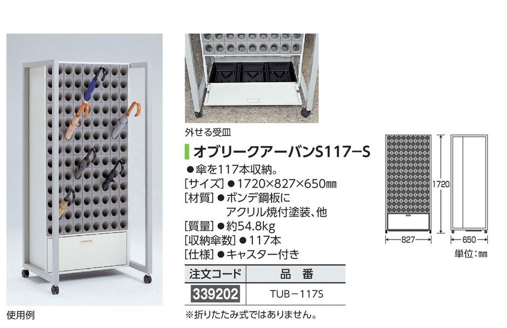 メーカー:日本緑十字社 サイズ 1720×827×650mm 材質 ボンデ鋼板にアクリル焼付塗装、他 質量 約54.8kg 収納傘数 117本 仕様 キヤスター付き ※折りたたみ式ではありません。