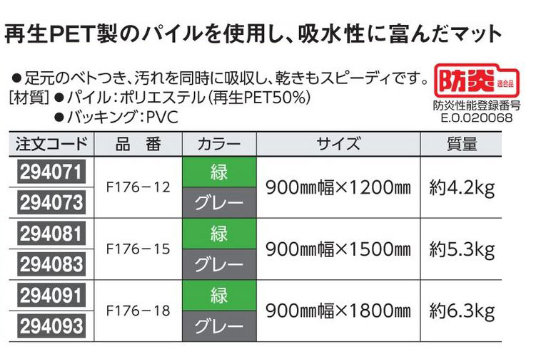 メーカー:日本緑十字社 カラー 緑 サイズ 900mm幅×1200mm 質量 約4.2kg 材質 パイル:ポリエステル(再生PET50%) パッキング:PVC
