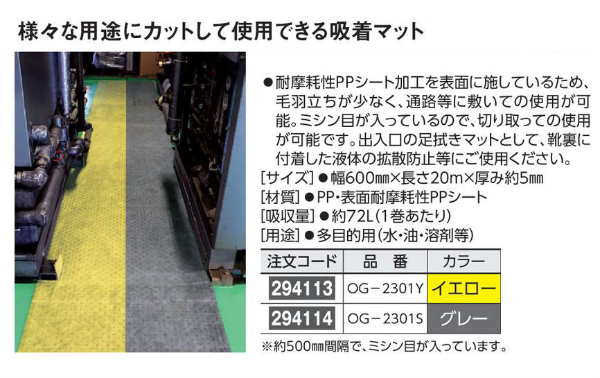 メーカー:日本緑十字社 カラー グレー サイズ 幅600㎜mm×長さ20m×厚み約5mm 材質 PP・表面耐摩耗性PPシート 吸収量 約72L(1巻あたり) 用途 多目的用(水・油・溶剤等) ※約500mm間隔で、ミシン目が入っています。