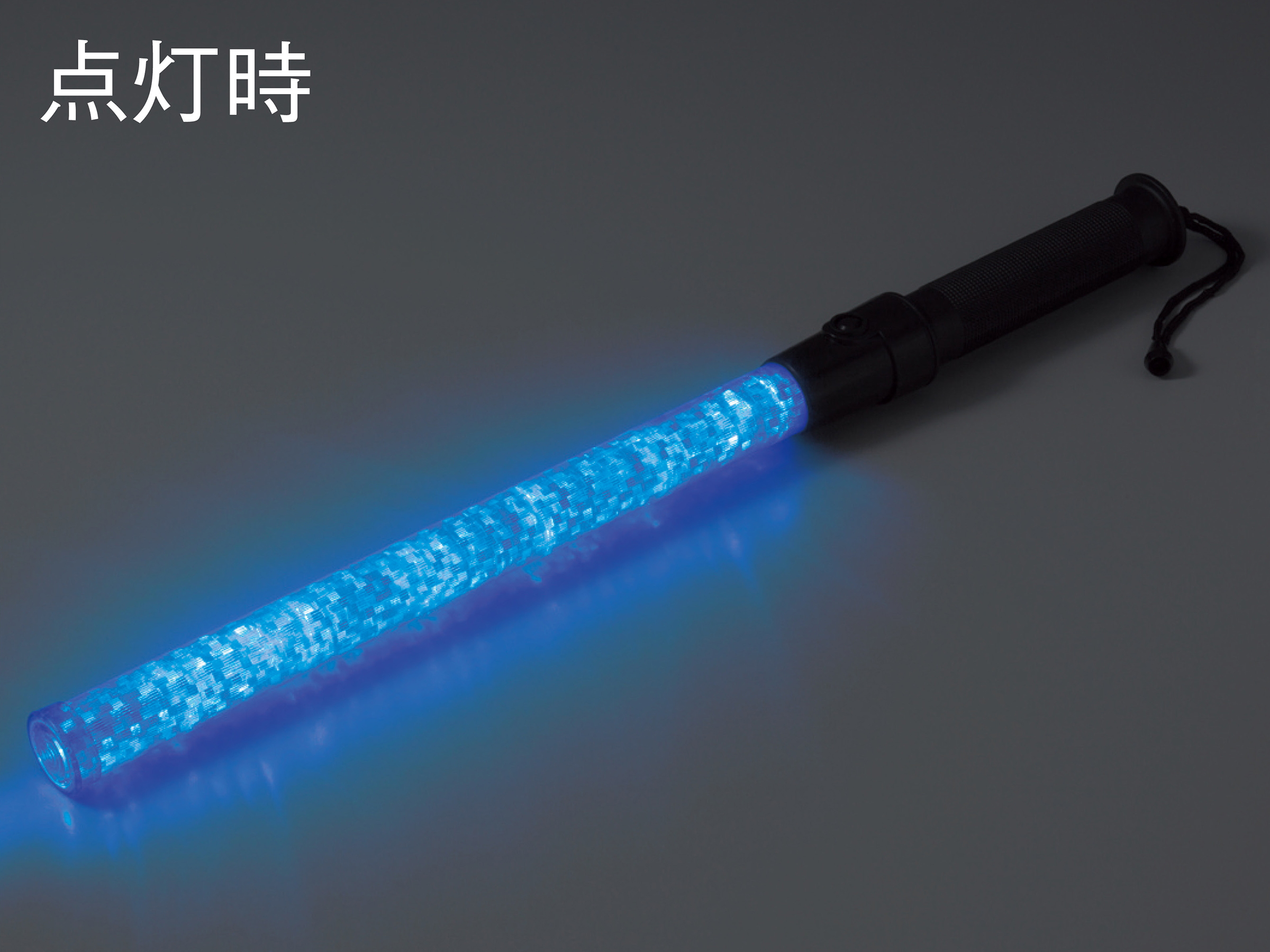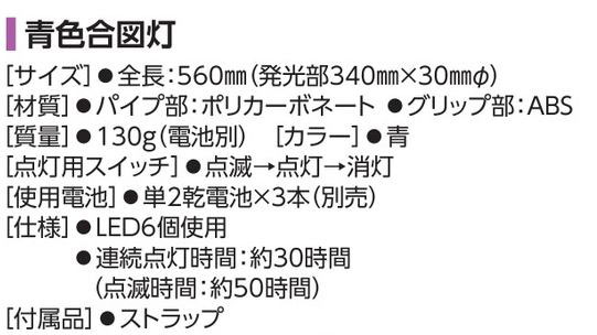メーカー:日本緑十字社 サイズ 全長:560mm(発光部340mm×30mmΦ) 材質 パイプ部:ポリカーボネート グリップ部:ABS 質量 130g(電池別) カラー 青 点灯用スイッチ 点滅→点灯→消灯 使用電池 単2乾電池×3本(別売) 仕様 LED6個使用 連続点灯時間:約30時間(点滅時間:約50時間) 付属品 ストラップ