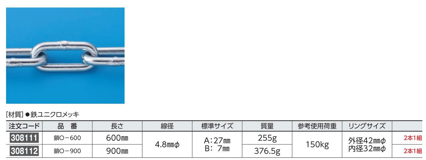 メーカー:日本緑十字社 長さ 600mm 線径 4.8mmΦ 標準サイズ A:27mm B:7mm 質量 255g 参考使用荷重 150kg リングサイズ 外径42mmΦ 内径32mmΦ 材質 鉄ユニクロメッキ 2本1組