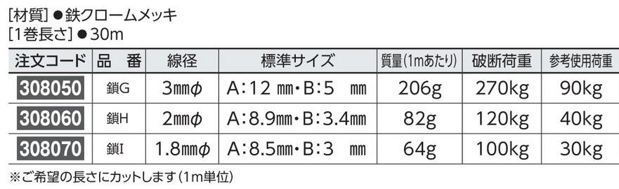 メーカー:日本緑十字社 線径 3mmΦ 標準サイズ A:12mm・B:5mm 質量(1mあたり) 206g 破断荷重 270kg 参考使用荷重 90kg 価格(1mあたり) 材質 鉄クロームメッキ 1巻長さ 30m ※ご希望の長さにカットします(1m単位)