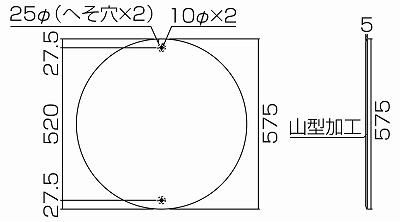 サイズ 575mm丸×1mm 材質 スチール 仕様 10mmφ穴×2(へそ穴)  山型 支柱用