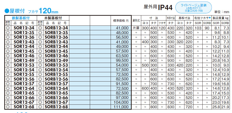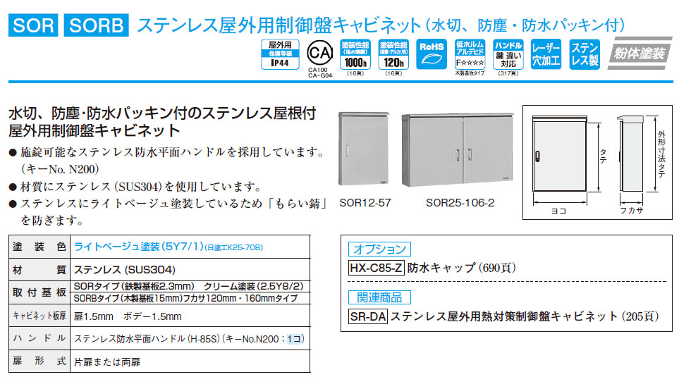 SOR12-43 ステンレス屋外用制御盤キャビネット(水切、防塵・防水パッキン付) 鉄製基板