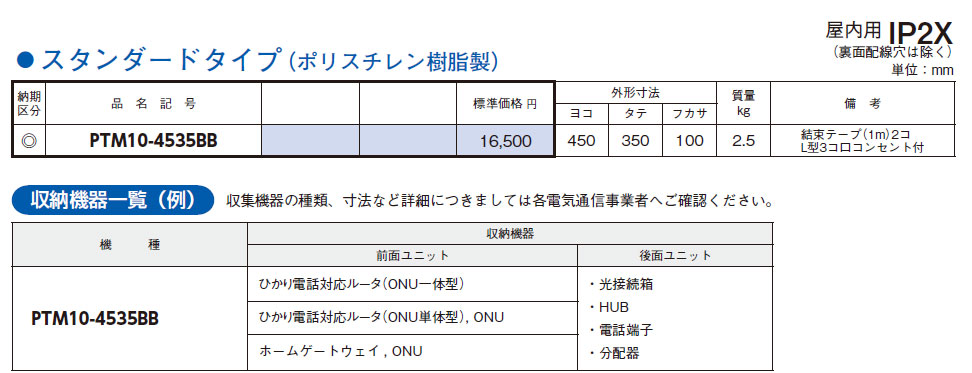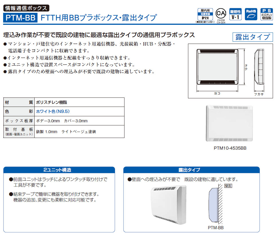 PTM10-4535BB FTTH用BBプラボックス・露出タイプ ポリスチレン樹脂製