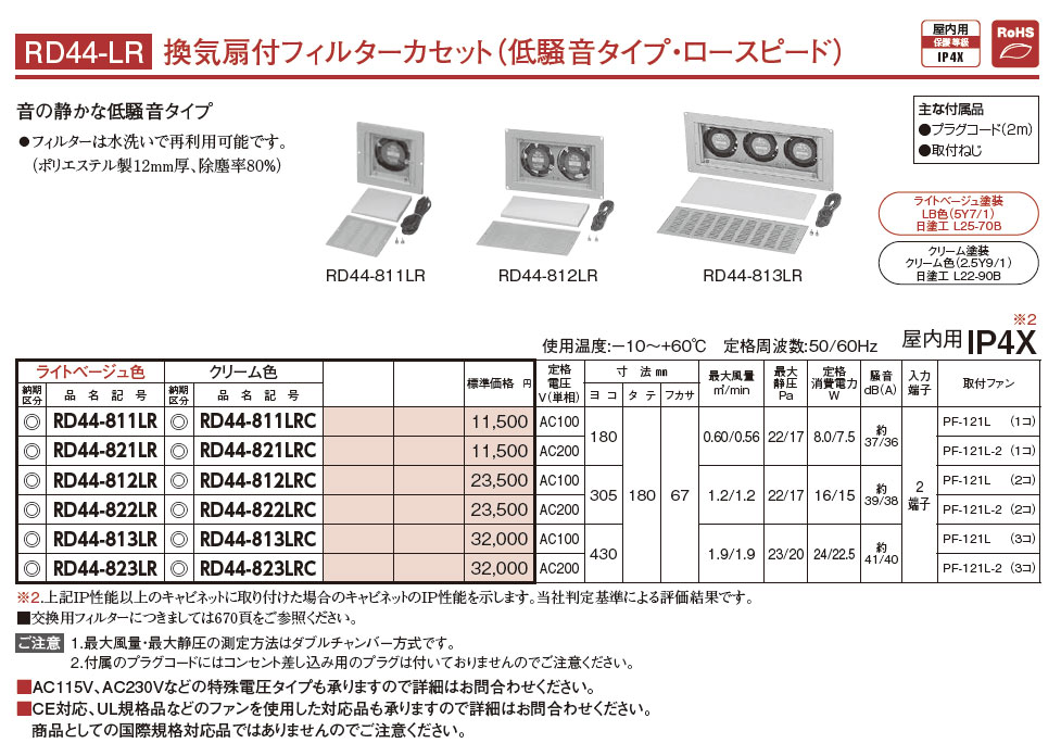 RD44-822LR 換気扇付フィルターカセット(低騒音タイプ・ロースピード)