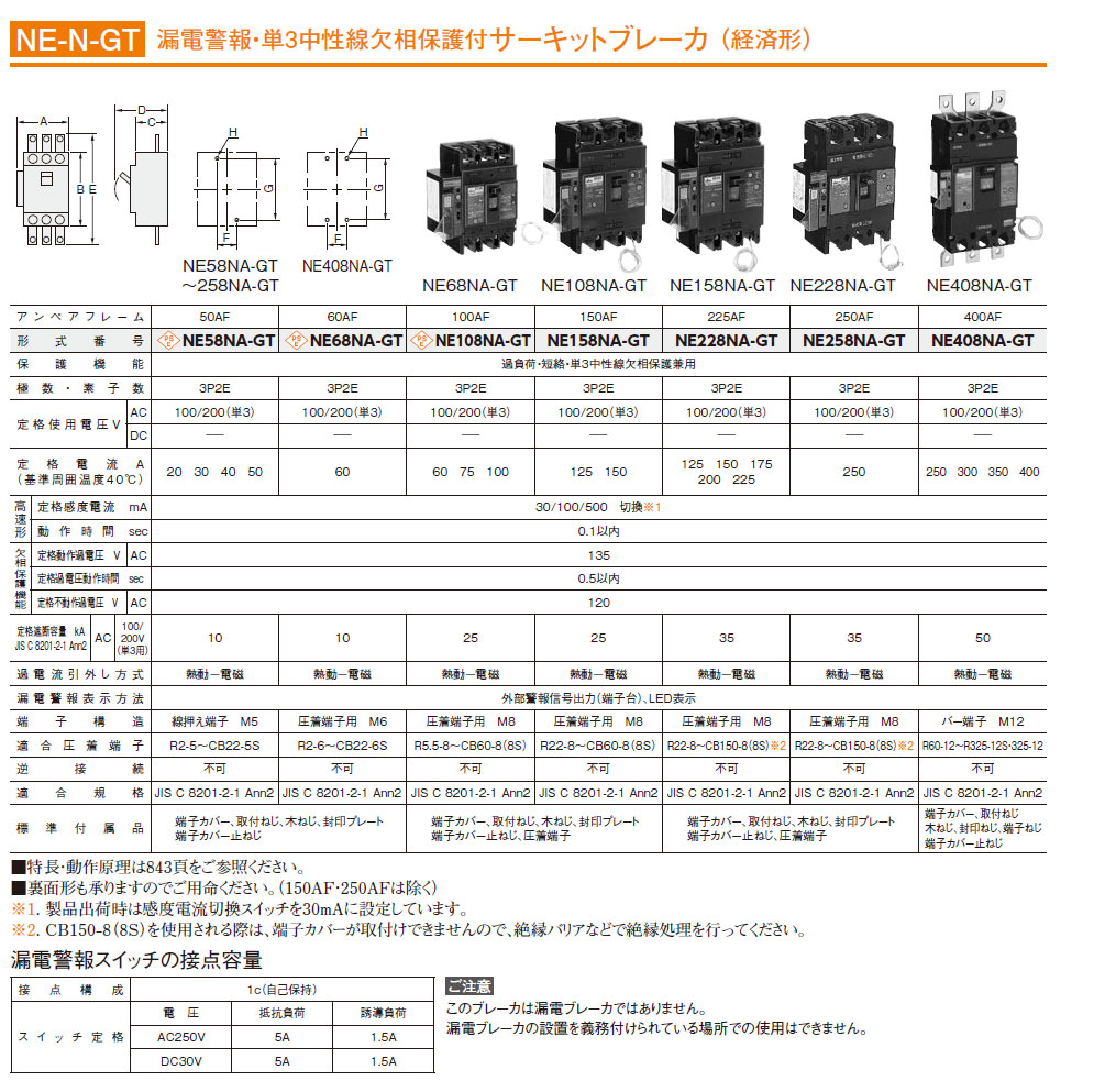 NE58NA-GT 3P 40A 漏電警報・単3中性線欠相保護付サーキットブレーカ(経済形)