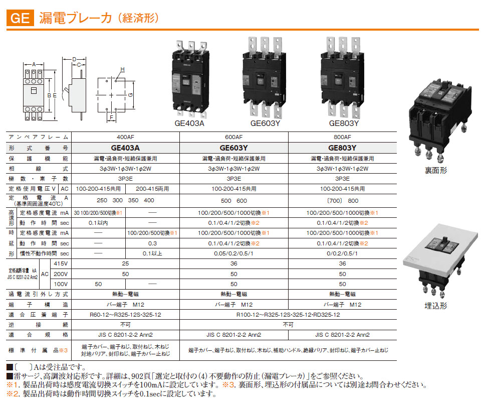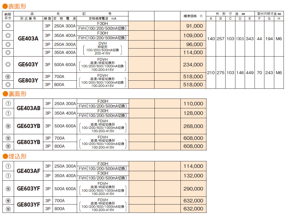 GE403AF 3P 400A FVH 漏電ブレーカ(経済形) 埋込形
