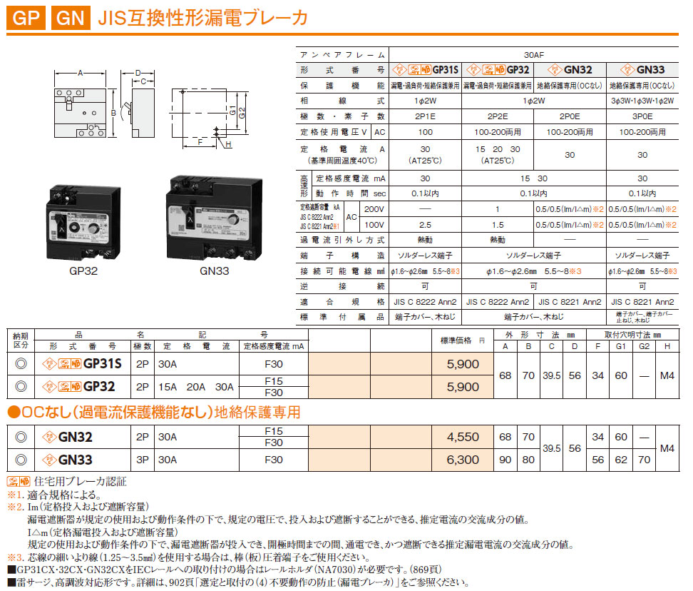 GP32 2P 30A F15 JIS互換性形漏電ブレーカ