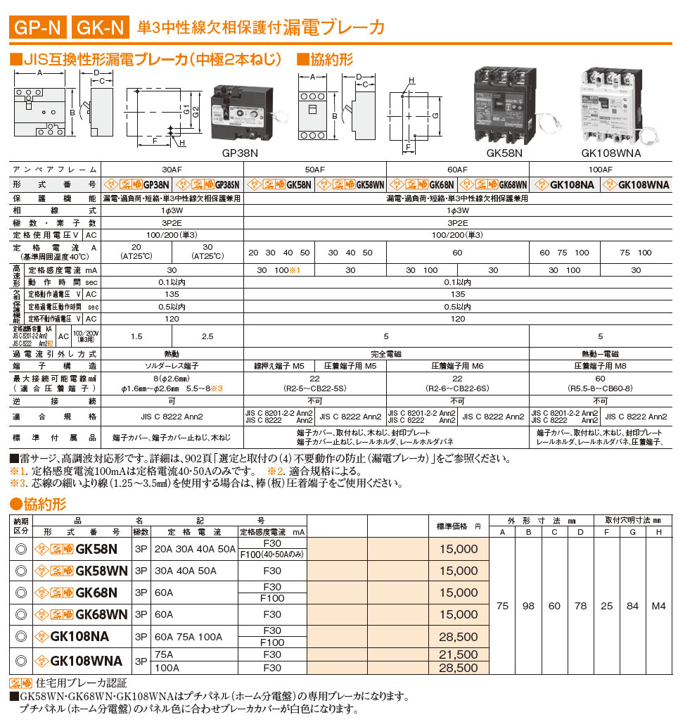 GK58N 3P 20A F30 単3中性線欠相保護付漏電ブレーカ 協約形