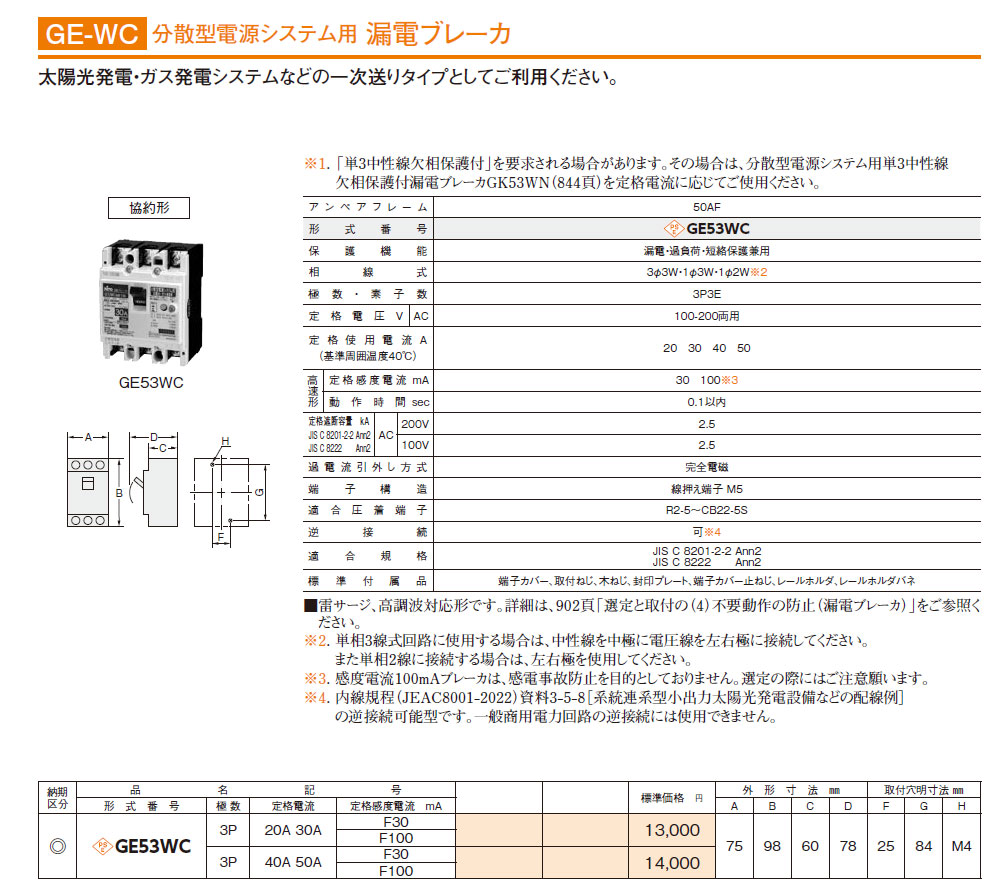 GE53WC 3P 20A F100 分散型電源システム用 漏電ブレーカ 協約形