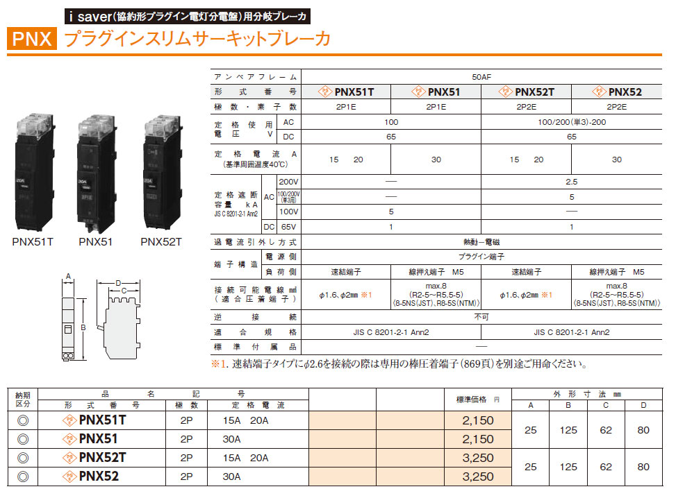 PNX51T 2P 20A プラグインスリムサーキットブレーカ