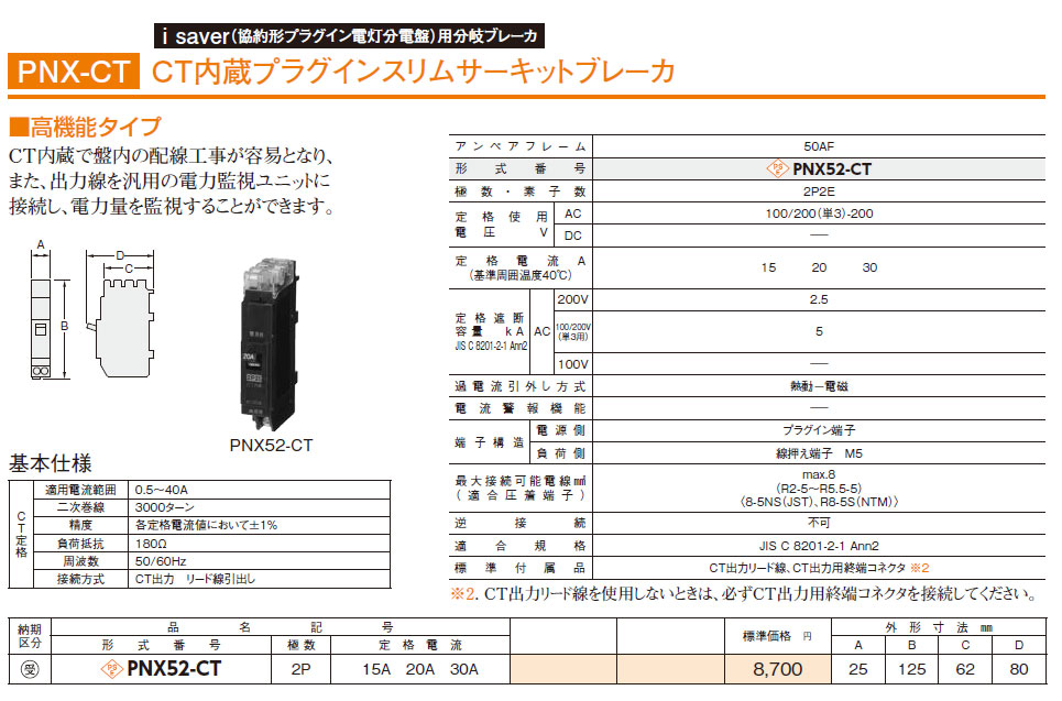 PNX52-CT 2P 15A CT内蔵プラグインスリムサーキットブレーカ