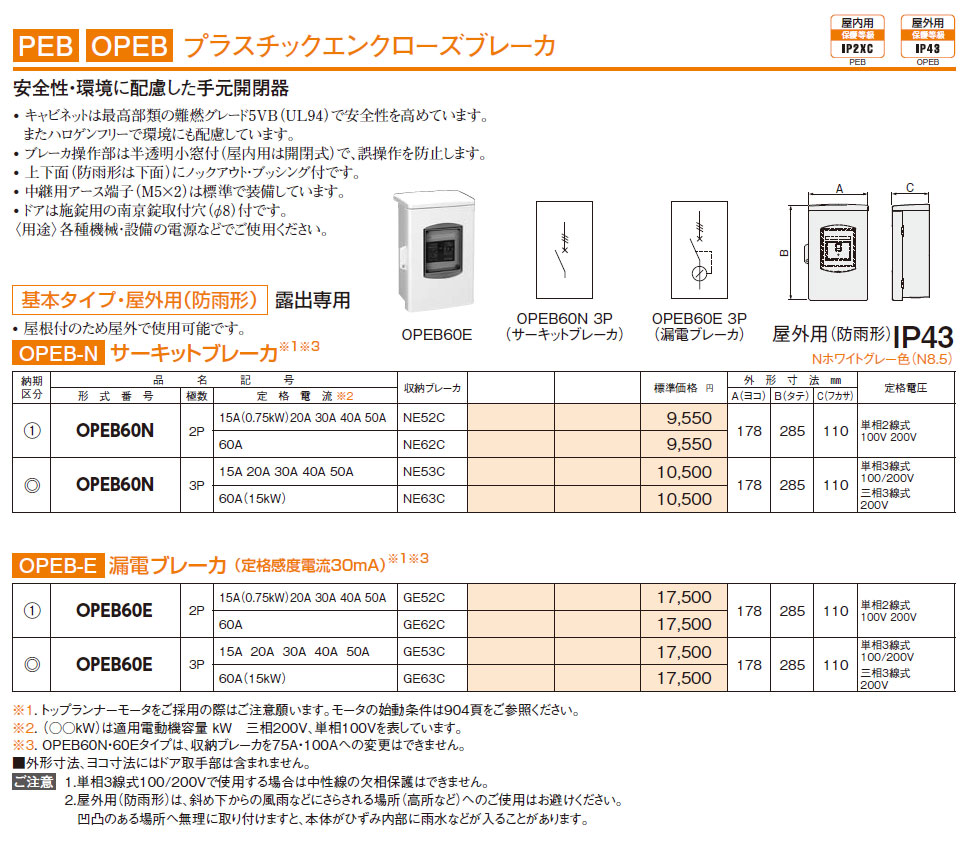OPEB60E 3P 60A プラスチックエンクローズブレーカ 基本タイプ・屋外用 漏電ブレーカ