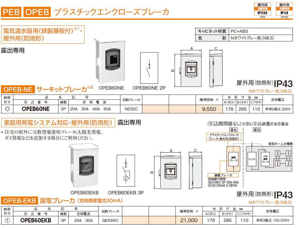 OPEB60NE 2P 60A プラスチックエンクローズブレーカ 電気温水器用(鉄製基板付)・屋外用 サーキットブレーカ