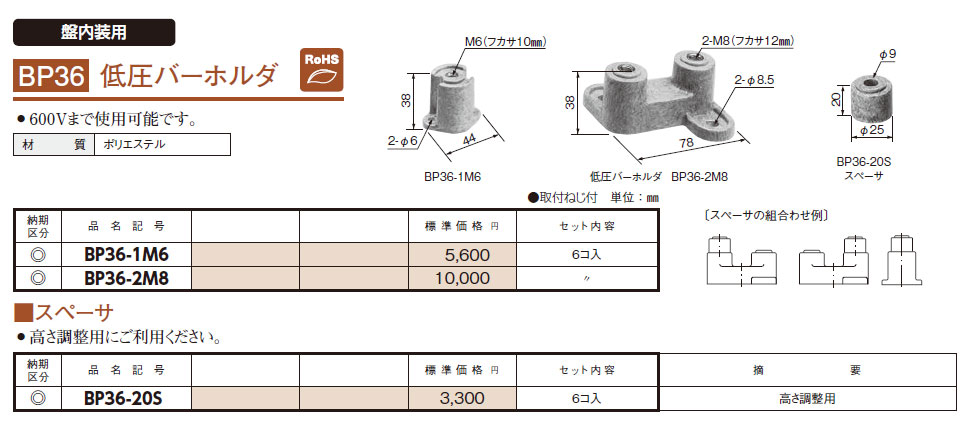BP36-20S 低圧バーホルダ スペーサ 6コ入
