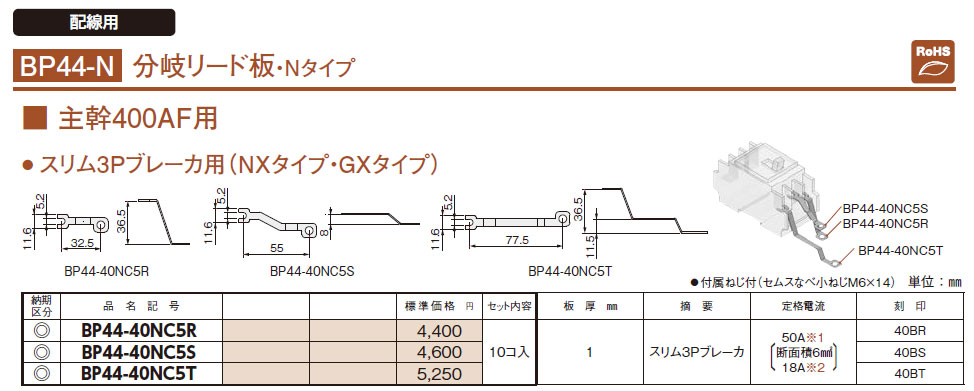 BP44-40NC5S 分岐リード板 主幹400AF用 スリム3Pブレーカ用