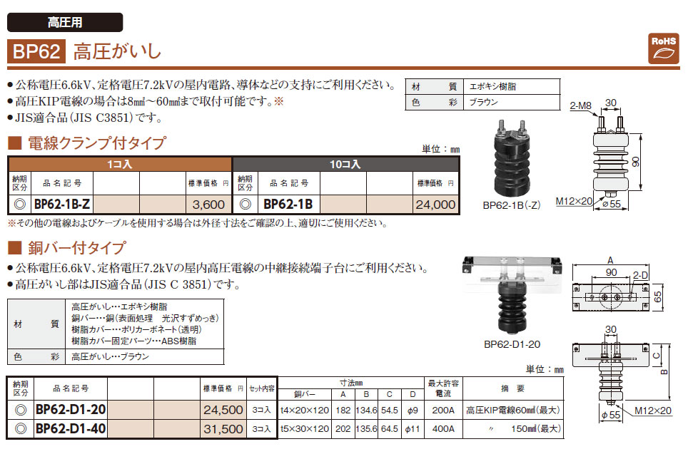 BP62-D1-20 高圧がいし 銅バー付タイプ 3コ入