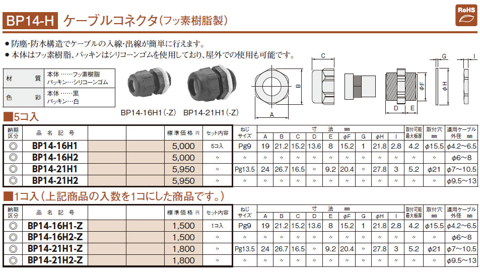 BP14-16H2-Z ケーブルコネクタ(フッ素樹脂製) 1コ入