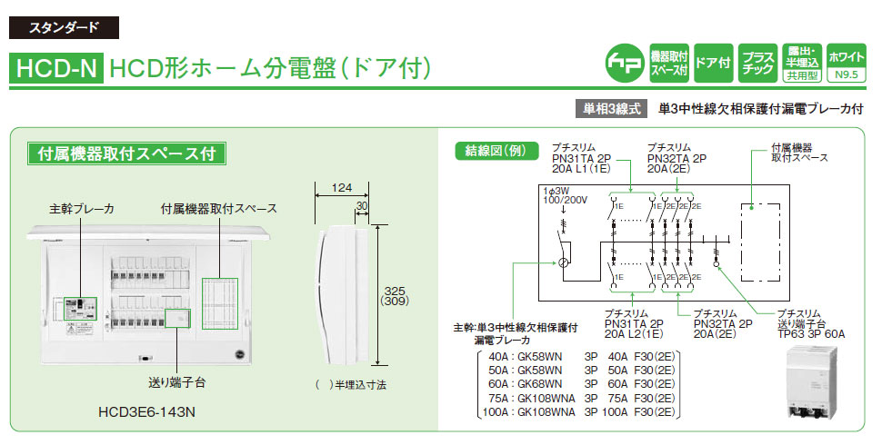 メーカー:日東工業 HCD形ホーム分電盤(ドア付)付属機器取付スペース付 38+3 100A 単相3線式 単3中性線欠相保護付漏電ブレーカ付