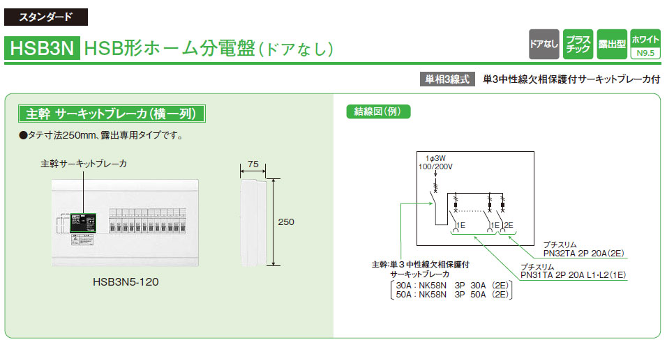 メーカー:日東工業 HSB3N形ホーム分電盤(ドアなし)主幹サーキットブレーカ 6+0 30A 単相3線式 単3中性線欠相保護付サーキットブレーカ付