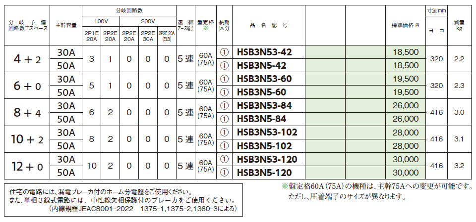 HSB3N53-60 HSB3N形ホーム分電盤(ドアなし)主幹サーキットブレーカ 6+0 30A