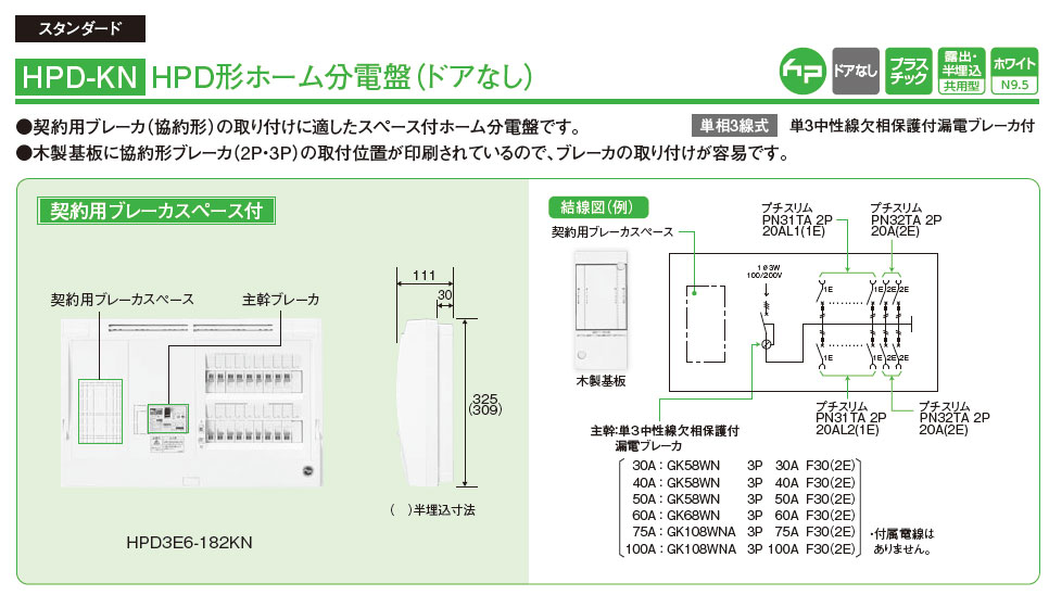 メーカー:日東工業 HPD形ホーム分電盤(ドアなし)契約用ブレーカスペース付 6+2 50A 単相3線式 単3中性線欠相保護付漏電ブレーカ付
