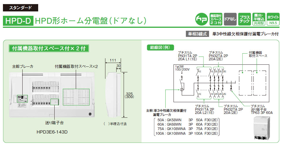 メーカー:日東工業 HPD形ホーム分電盤(ドアなし)主幹サーキットブレーカ 6+6 50A 単相3線式 単3中性線欠相保護付サーキットブレーカ付