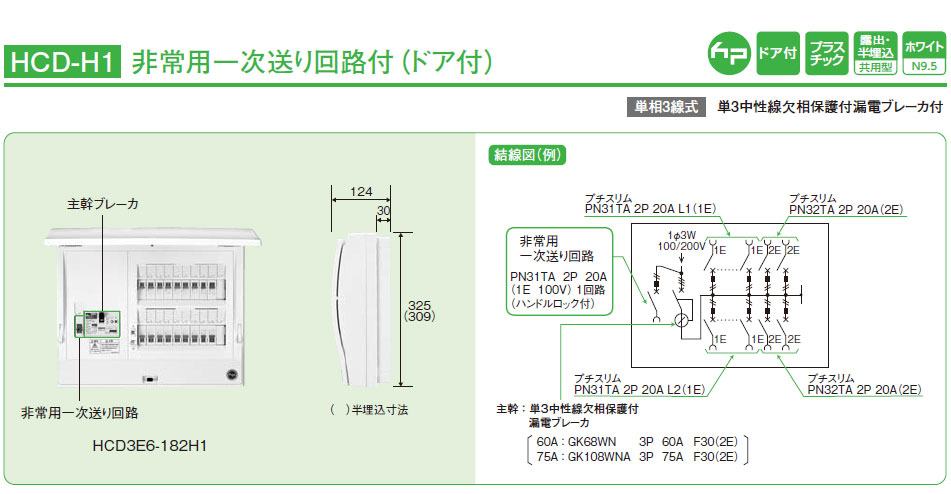 メーカー:日東工業 HCD-H1 ホーム分電盤 非常用一次送り回路付(ドア付) 10+2 60A 単相3線式 単3中性線欠相保護付漏電ブレーカ付