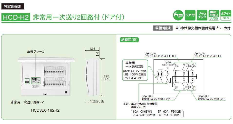 メーカー:日東工業 HCD-H2 ホーム分電盤 非常用一次送り2回路付(ドア付) 22+2 60A 単相3線式 単3中性線欠相保護付漏電ブレーカ付