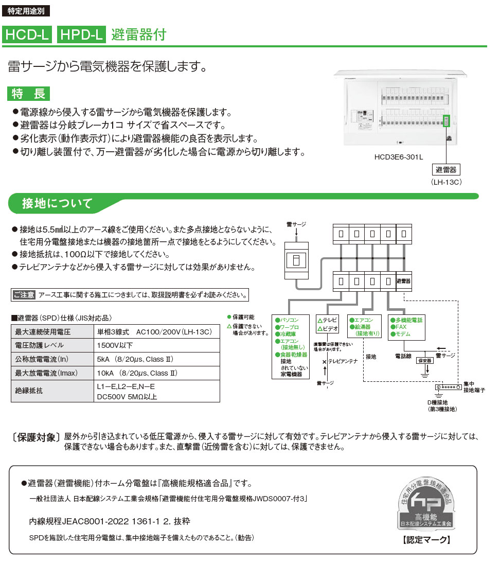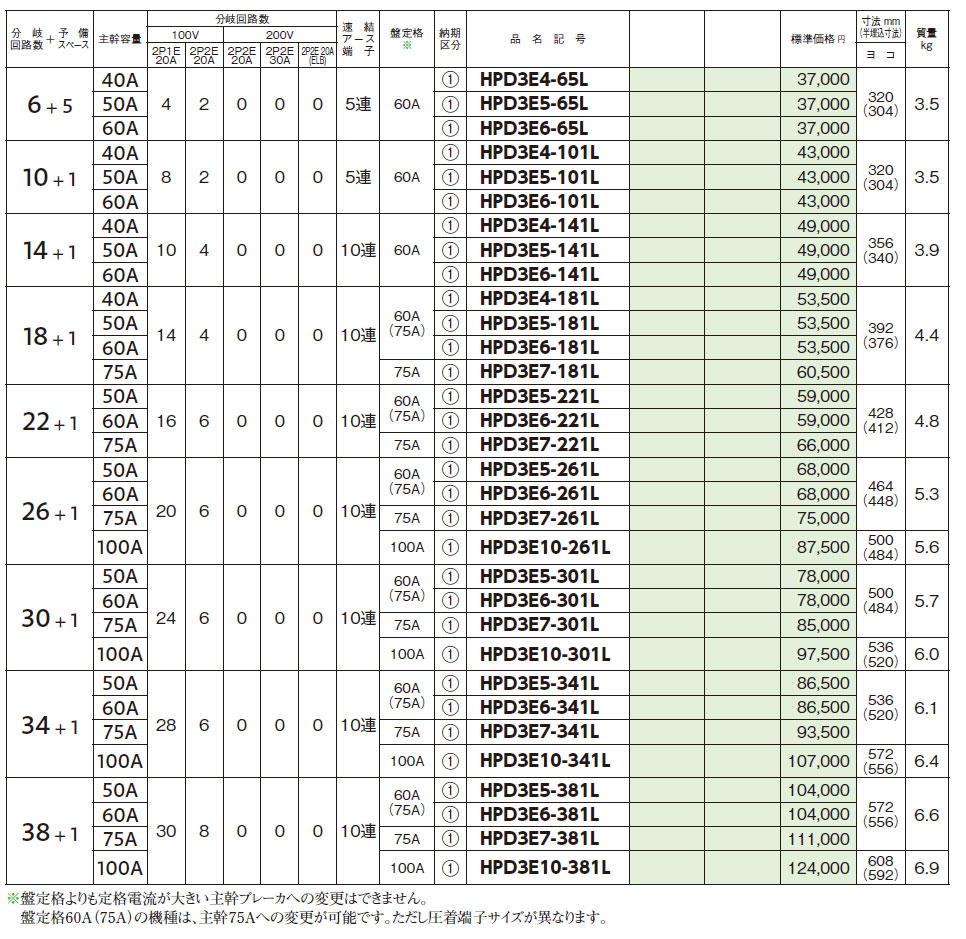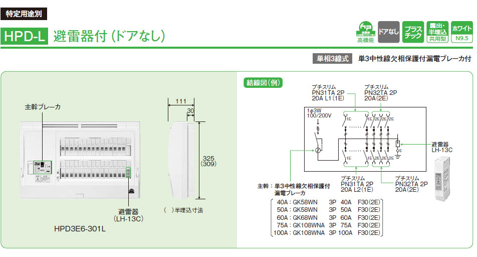 HPD3E6-65L HPD-L ホーム分電盤  避雷器付(ドアなし) 6+5 60A