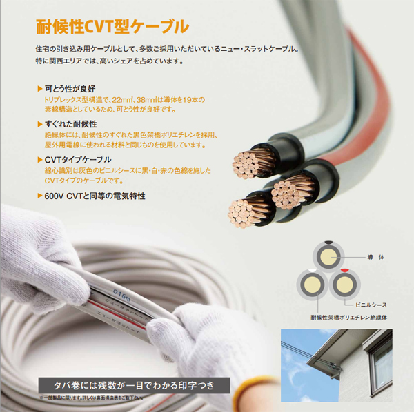 特殊な方法で絶縁被覆を行っているので、一般のCVケーブルに比べ皮剥ぎ作業が容易です。