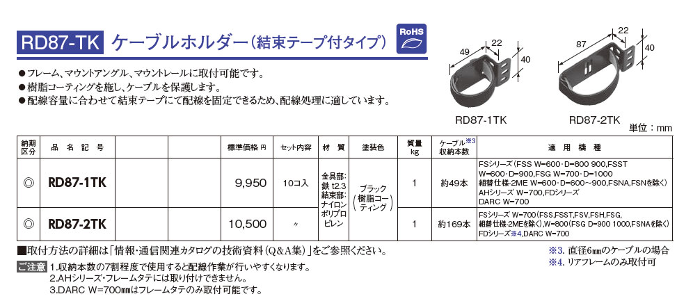 RD87-2TK ケーブルホルダー樹脂タイプ(結束テープ付タイプ)