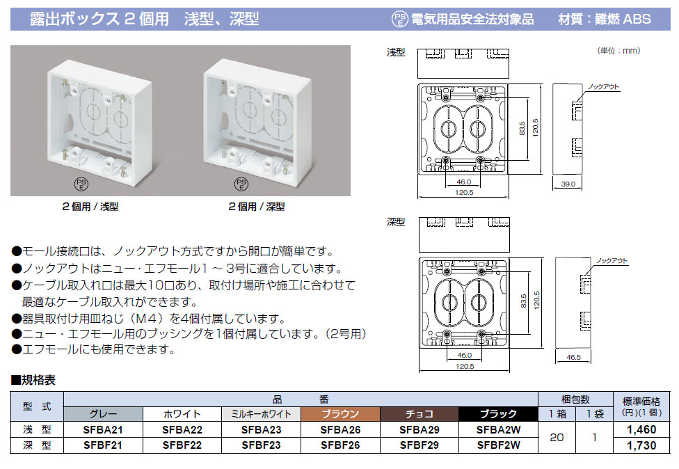 SFBF21 ニューエフモール 露出ボックス2個用深型 1袋(1個入)