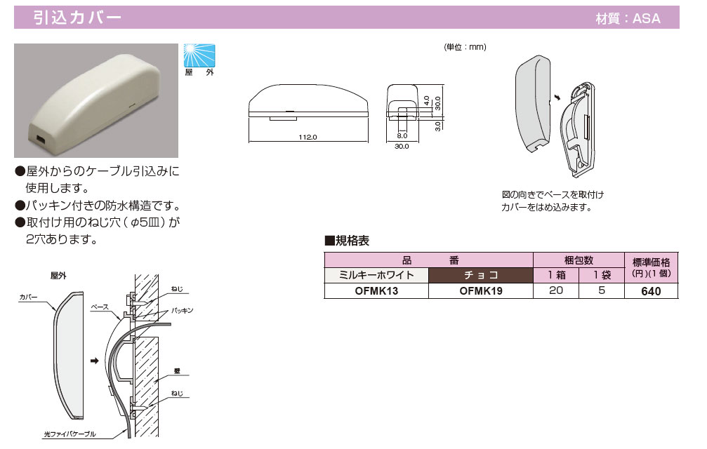 - 電設資材 > マサル工業 > 光ファイバ配線モール > オプトモール2号 > 引込カバー