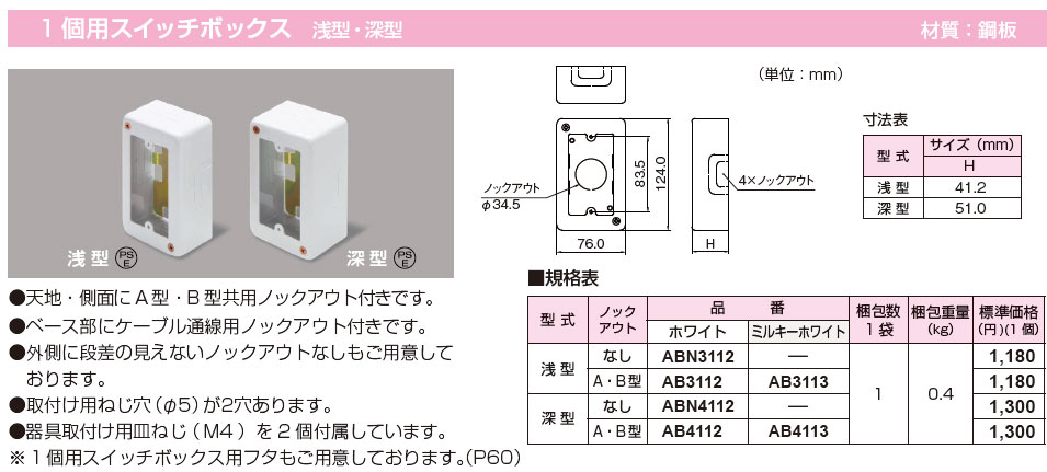 ABN3112 メタルエフモール 1個用スイッチボックス浅型 1袋(1個入)