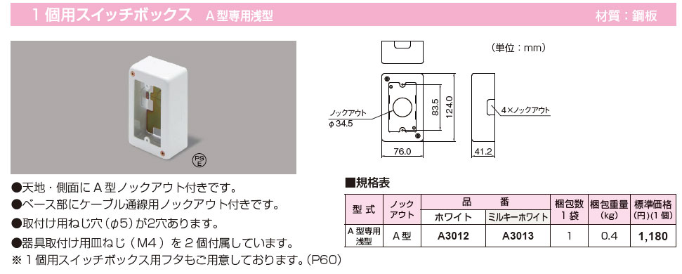A3012 メタルモール 1個用スイッチボックスA型専用浅型 1袋(1個入)
