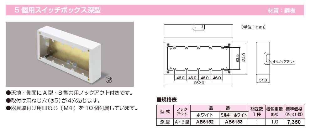 AB6152 メタルモール 5個用スイッチボックス深型 1袋(1個入)