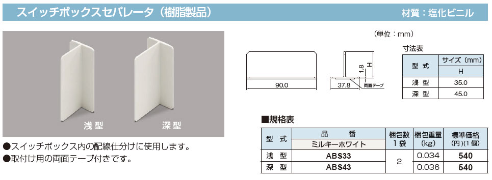 ABS33 メタルモール スイッチボックスセパレータ(樹脂製品) 浅型 1袋(2個入)