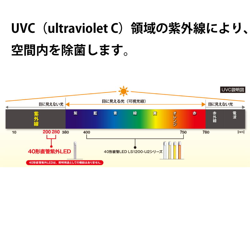既存の40形蛍光灯器具に工事不要で取付け可能なUVC除菌LED。短波長の紫外線(UVC: 約275nm)で空間内のウイルス・細菌に働きかける紫外LEDランプです。