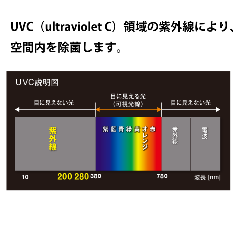 - UVC(200~280nm)の短波長紫外線で除菌に活用される領域(本製品は275nm)。